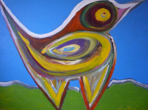 Werkt met acrylverf en gebruikt naast de kwast ook een bankpas en een vaatdoek! Net zoals het uitkomt.